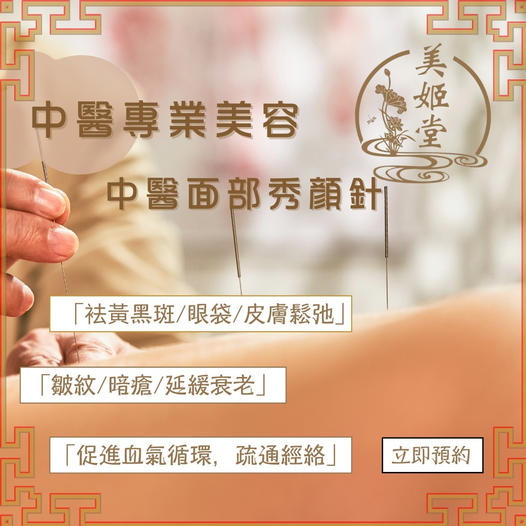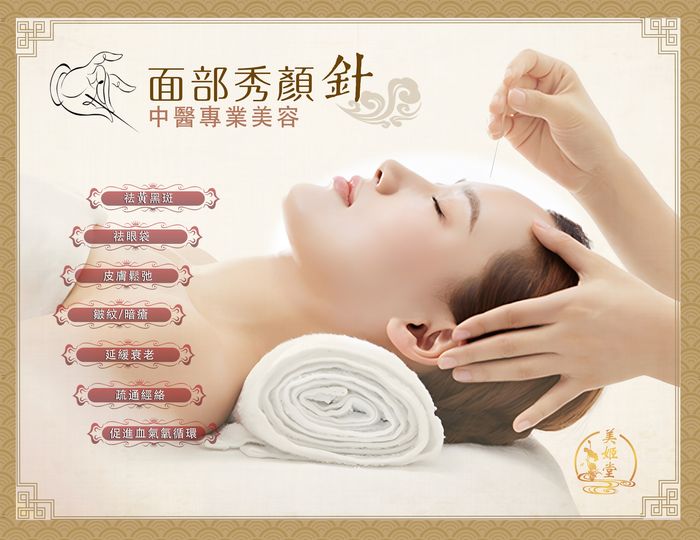 以臉部美容為例子,中醫嘅治療範圍包括黃黑斑、眼袋、皮膚鬆弛、皺紋或暗瘡等。目前比較常見嘅「美容針」通過刺激穴位,調理內臟促進血氣循環,疏通經絡,達到延緩衰老及美顏功效。